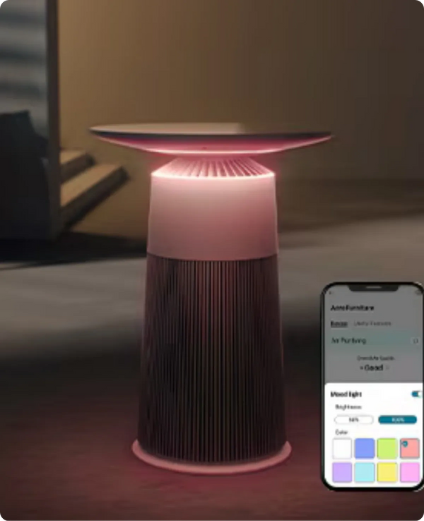 LG PuriCare™ AeroFurniture is the new generation air purifier, combining a stylish table with an air purifier to bring fresh air into your home. Make the most of your space with a chic table that also brings fresh air, perfect for small spaces. The HEPA filter air purifier features 360° suction, removing up to 99.9% of pollutants in the air, boosting your indoor air quality. Ultra quiet operation, Smart Control.