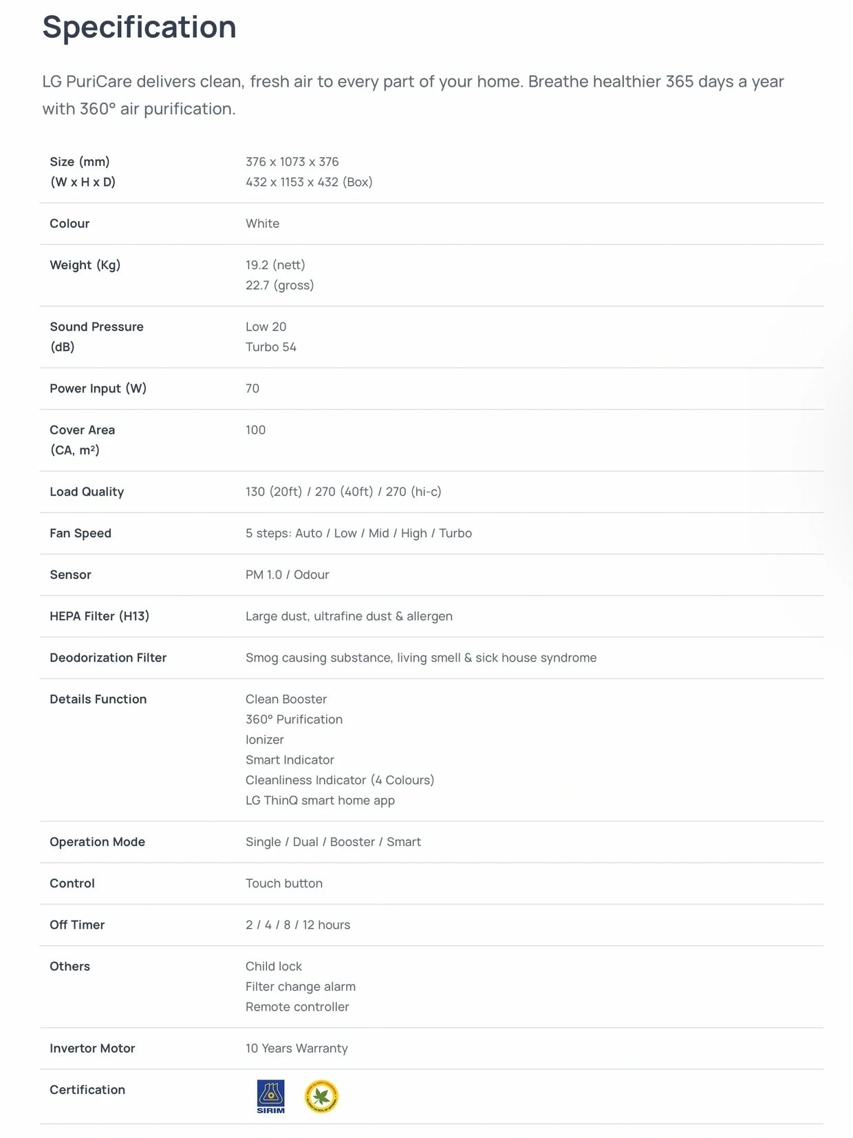 Remove virus, bacteria, dust, gas odour with LG PuriCare 360º Air Purifier. Highly recommend if you have kids, pets, cook in home or closed air-conditioning environment area.