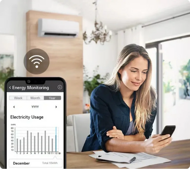 The LG ThinQ™ app continuously monitors your air conditioner. Whether it’s everyday maintenance or something else, the app allows you to easily monitor energy usage