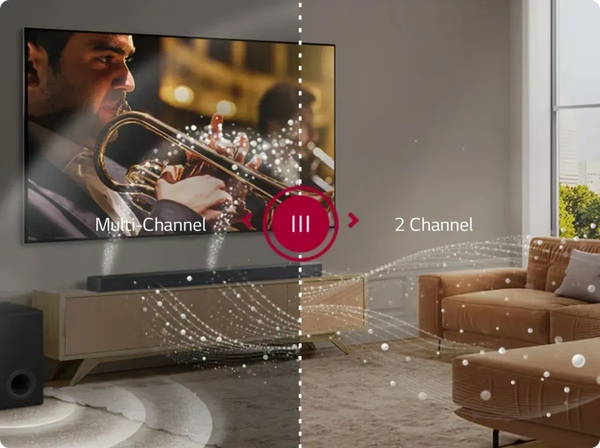 The LG Soundbar converts basic 2-channel audio into multi-channel audio for deep sound that resonates through your space.