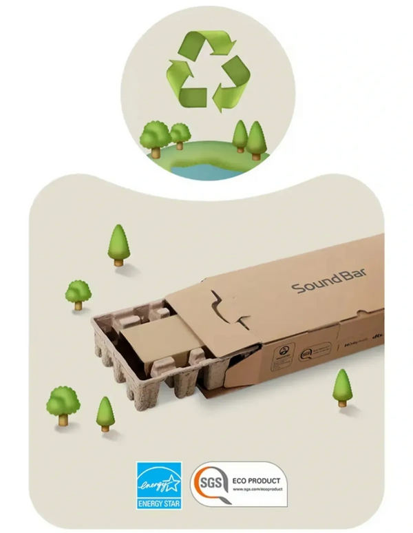 The LG Soundbar has been certified by SGS as an Eco Product due to a change in internal packaging from EPS foam (Styrofoam) and plastic bags to recycled molded pulp — an environmentally friendly alternative that still protects the product.