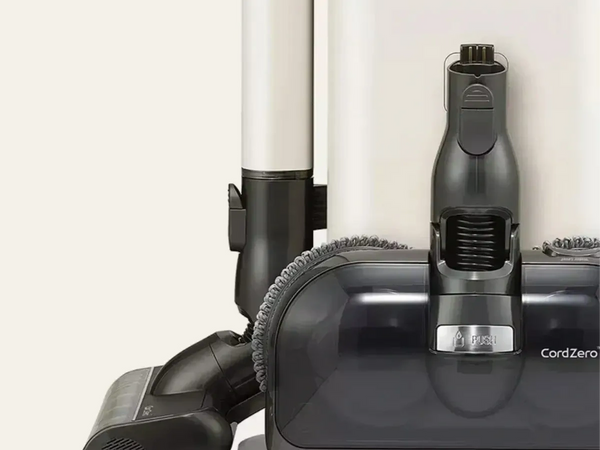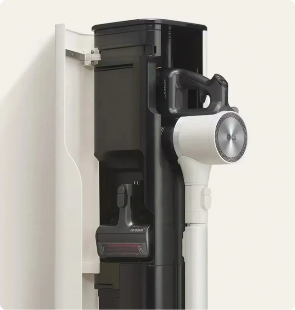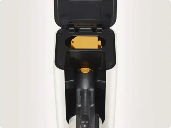 The sleek and ingenious design stores, charges, and empties the CordZero all at the same time.