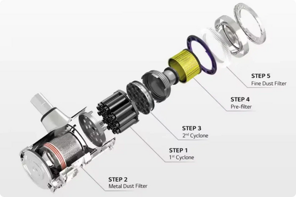 The 5-step filtration system separates suctioned dust in the dust bin and then filters the remaining fine dust--filtering out an average 99.999% of 0.5㎛ ~ 4.2㎛ particles.
